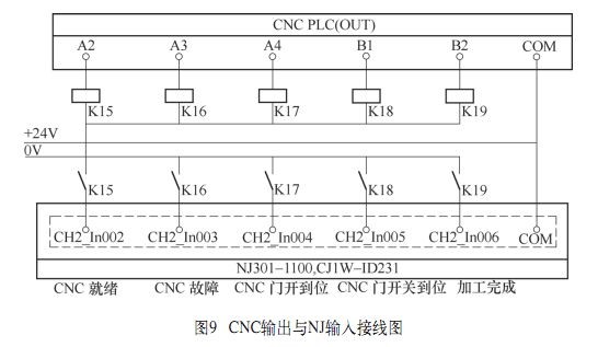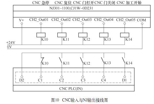 CNC機(jī)床PLC的輸出接口為源型輸出,而NJ PLC的輸入接口必須接為漏型,所以CNC機(jī)床PLC的輸出信號(hào)通過中間繼電器進(jìn)行過渡。CNC輸出與NJ輸入接線圖如圖9所示。CNC輸入與NJ輸出接線圖如圖10所示。