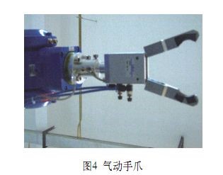 選擇工業(yè)機(jī)器人末端執(zhí)行器應(yīng)考慮夾取對(duì)象的形狀與質(zhì)量,本實(shí)例選擇氣動(dòng)手爪,如圖4所示,型號(hào)為HDS-20Y,控制手爪動(dòng)作的電磁閥安裝在S608H機(jī)器人本體上。若工件質(zhì)量大,可選用液壓手爪。