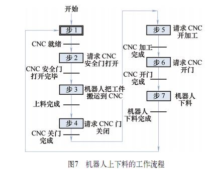 機(jī)器人上、下料時(shí),需要與CNC進(jìn)行信息交換、互相配合,才能有條不紊地工作。機(jī)器人上下料的工作流程如圖7所示。