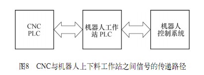 CNC與機(jī)器人上下料工作站PLC之間信號(hào)的傳遞路徑如圖8所示。CNC機(jī)床PLC與上下料工作站PLC之間進(jìn)行信息交換,機(jī)器人控制系統(tǒng)與上下料工作站PLC之間進(jìn)行信息交換。