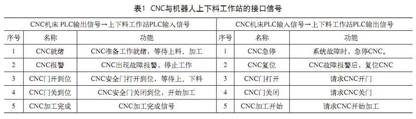 CNC與機(jī)器人上下料工作站的接口信號(hào)如表1所示。上下料工作站PLC向CNC機(jī)床PLC發(fā)出指令,如“請(qǐng)求CNC開門”、“請(qǐng)求CNC關(guān)門”等,指令的執(zhí)行由CNC機(jī)床PLC來(lái)完成。