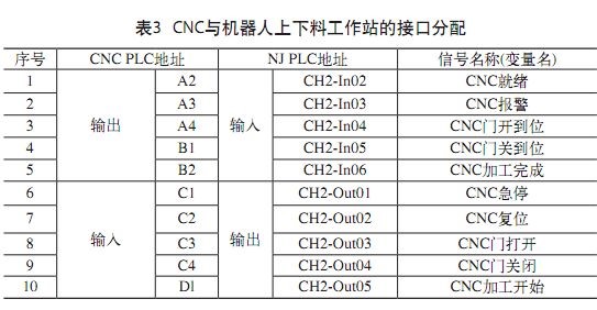 機(jī)器人上下料工作站PLC的配置如表2所示,CNC與機(jī)器人上下料工作站的接口分配如表3所示。